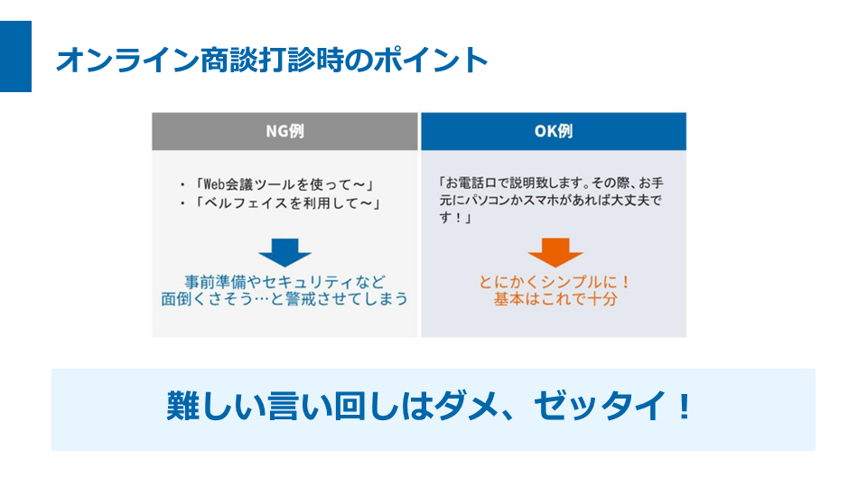 このように、お客様がわかる言葉だけを使って案内するのがポイントです。理解を妨げるノイズがないので、「それならまあ…」とアポイントが取れる展開が生まれます。