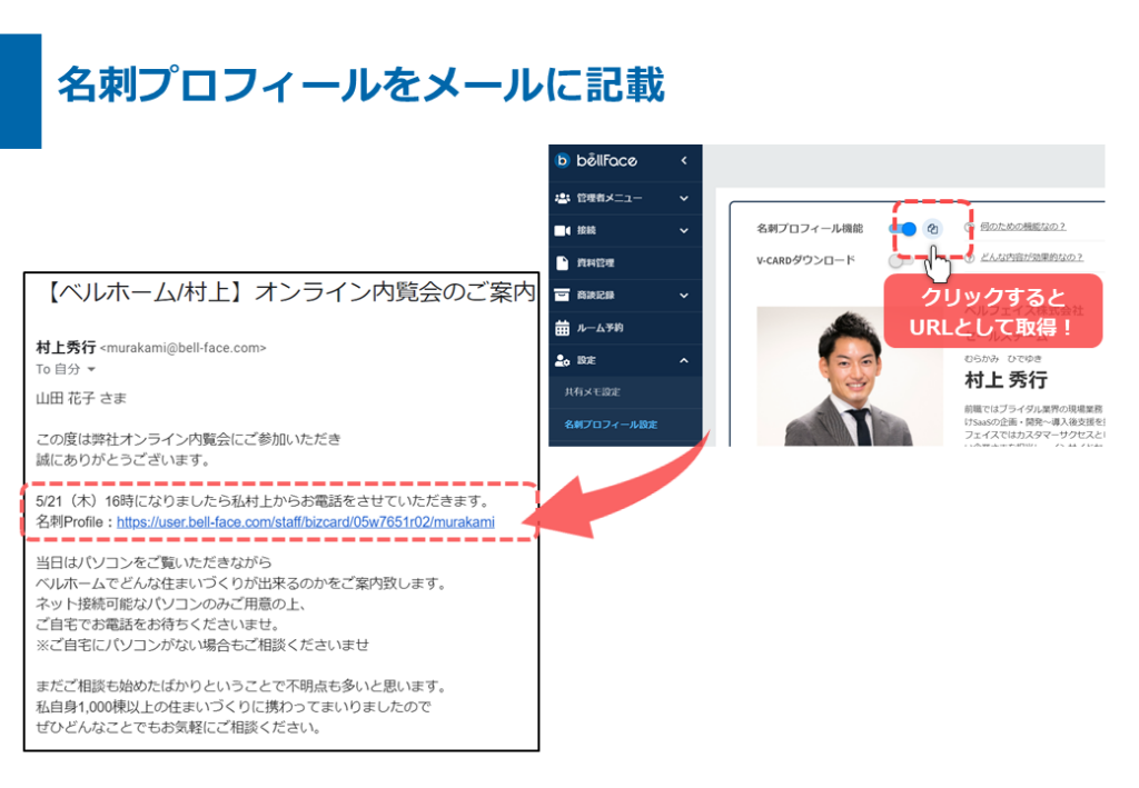 ベルフェイスの機能の一つ「名刺プロフィール」。URLをクリックするだけでプロフィールが確認できる