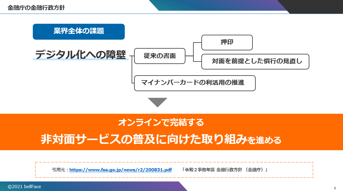 その中では「業界全体の課題である”デジタル化への障壁”、すなわち従来の書面、押印、対面を前提とした慣行を見直し、オンラインで完結する非対面のサービスを普及させていく取り組みを進める」と述べられている。