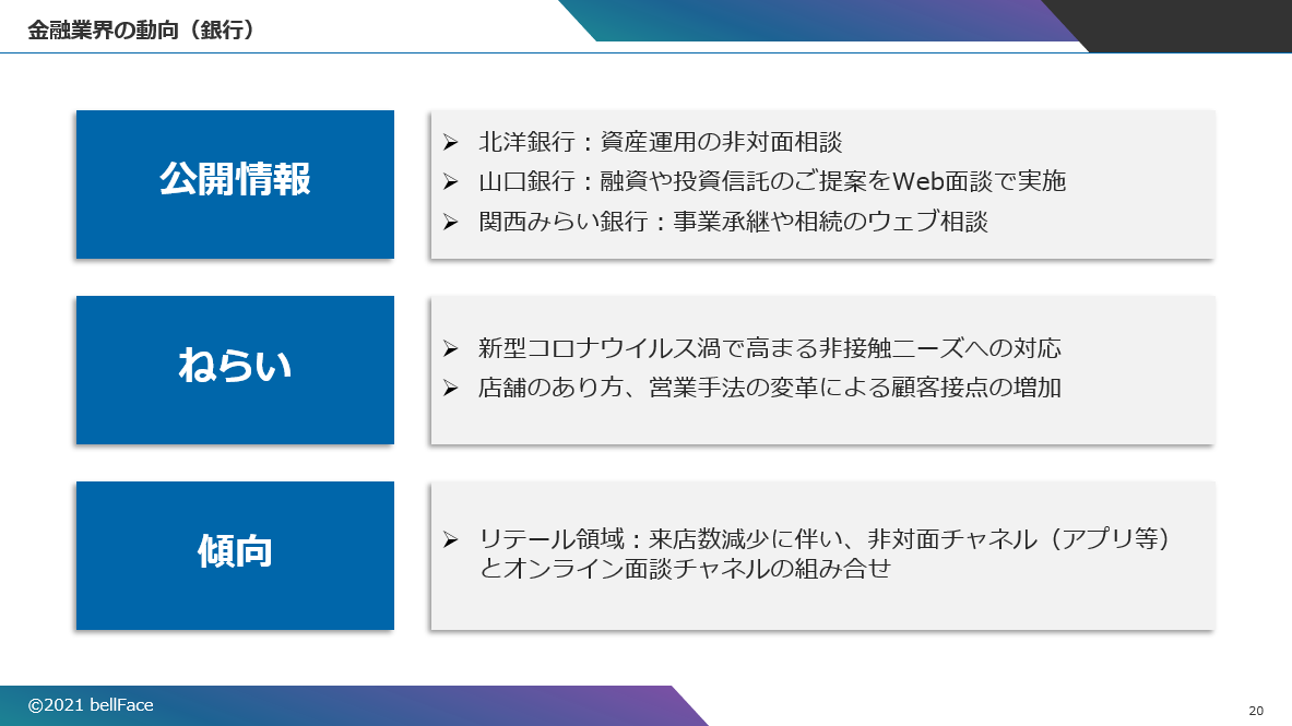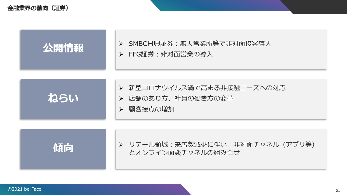 ちなみに銀行や証券会社では、コロナ禍の来店数減少に伴い、リテール領域で非対面営業の導入が進められている。