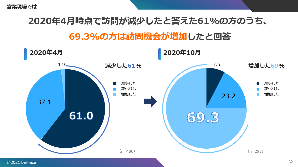 2020年4月、1度目の緊急事態宣言が出た時点で「訪問が減少した」は「61%」だったが、半年後の10月には「69.3%」が訪問機会が増えたという回答結果だ。