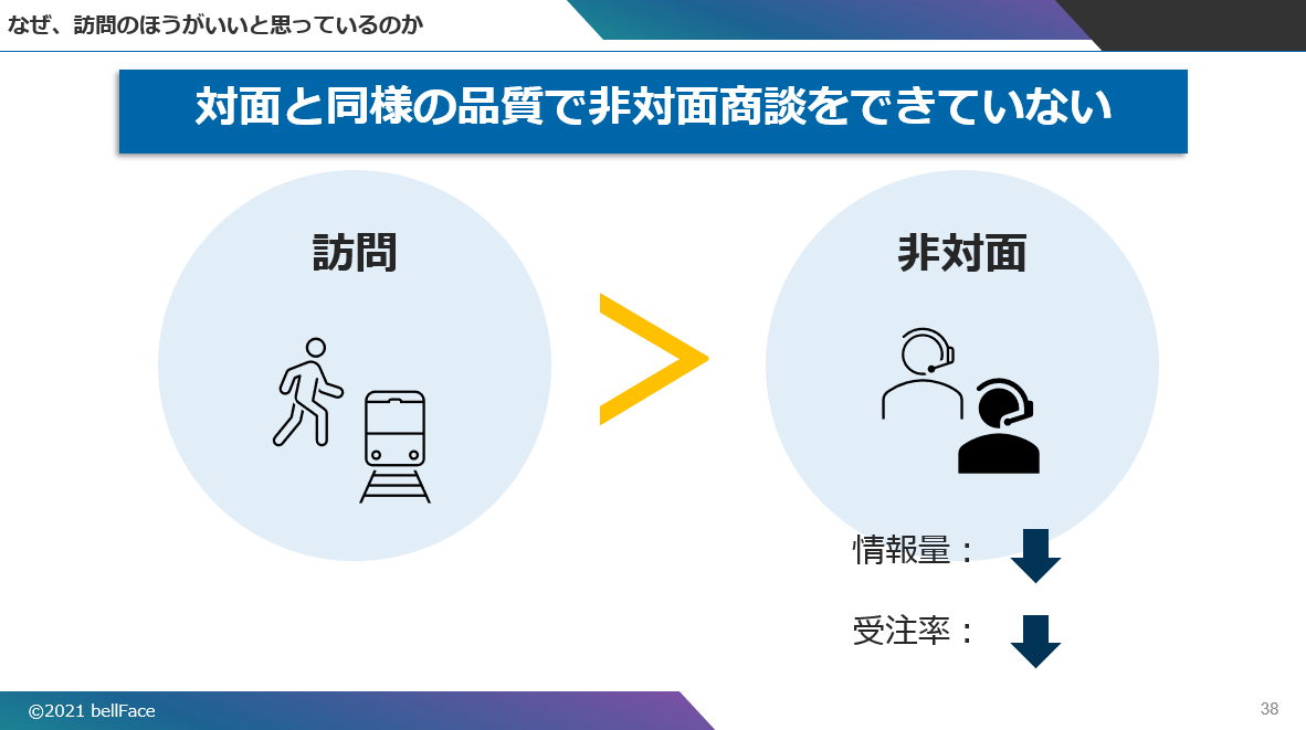 その理由は、対面で行っていた商談をそのまま非対面で同様に実施しているからだ。この場合、伝わる「情報量」が減って品質が落ち、結果として「受注率」が下がることになる。