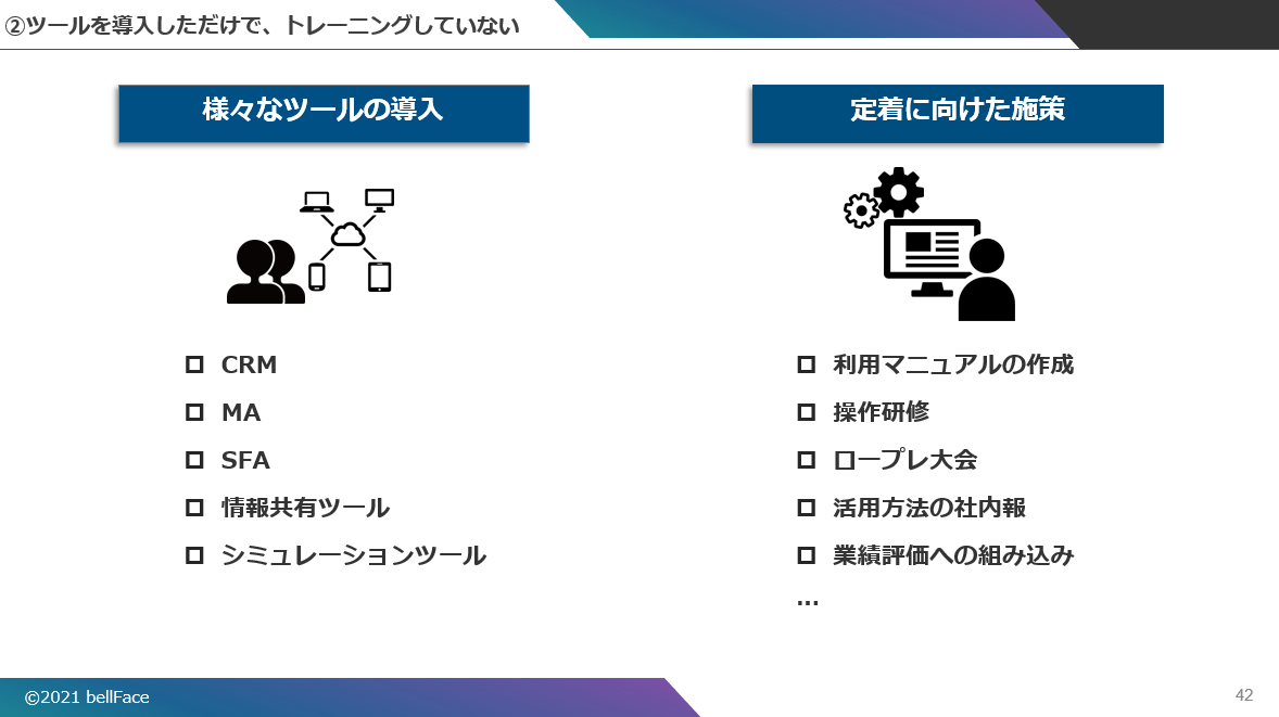 現場の個々人に利用を任せるのではなく、よりツールを使いやすくなるよう、マニュアル作成、研修、ロープレ大会などトレーニングを実施しなければ、非対面営業は浸透しない。