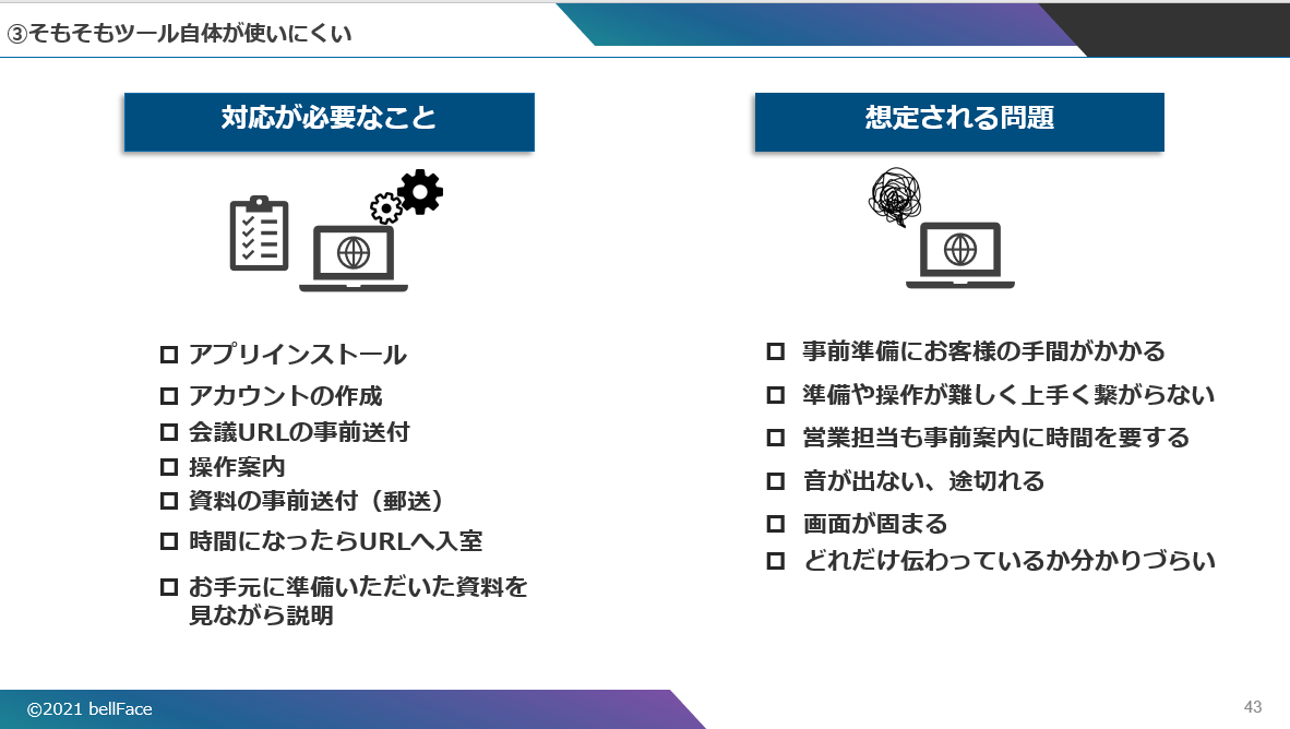 このような問題が生じると、お客様も営業担当も手間がかかるため「訪問して会った方が早い」という結論に至る。