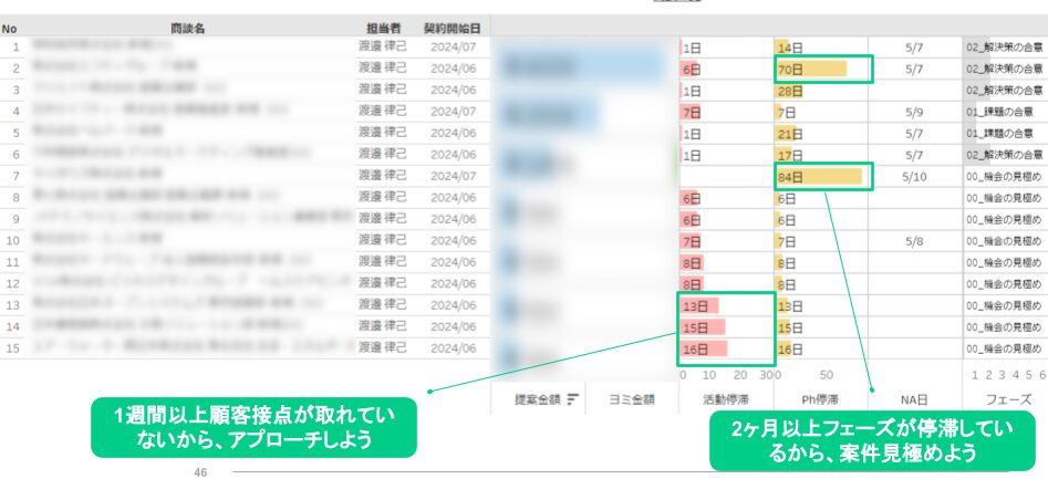 フェーズ進行が停滞している案件には、早急に対応策を検討しましょう。