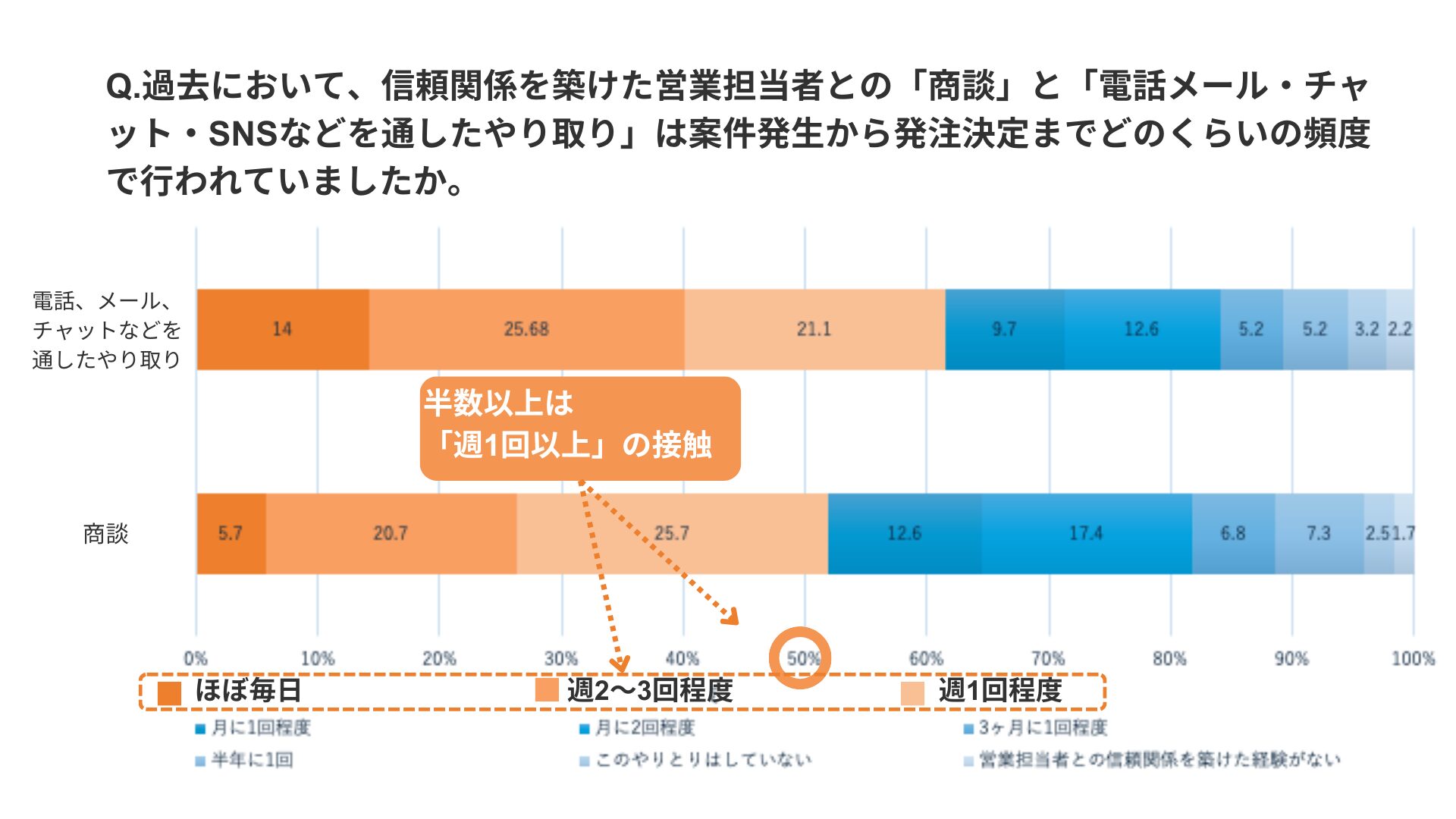 一方で、企業の購買担当者の4割近くが、「営業担当者と週2、3回以上の接点を持っている」と回答し、半数以上は「週1回以上」と回答しています。つまり、お客様接点の時間を増やすことは営業成績向上に不可欠と言っても過言ではありません。