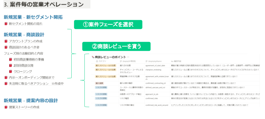 ①案件の進捗状況を把握し、フェーズ進行の停滞を防ぐ