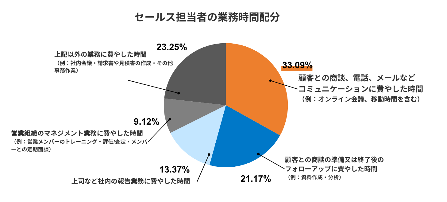 営業担当者の業務につかっている時間割合※調査よると、営業担当者がお客様との接触に費やせる時間は業務全体のわずか3割で、残りの7割は資料作成や事務作業に費やされています。