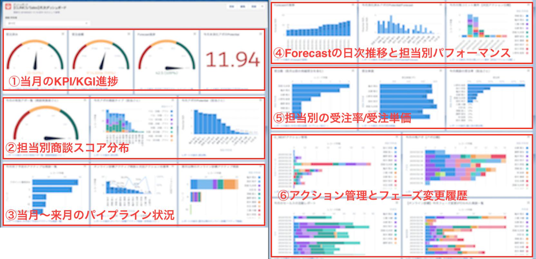 という流れで作っています。最初におそらく誰もが見ているであれば最重要のKGI・KPIが見えるようにしていて、それ以降は受注までのフローを意識しています。最後にアクションという形です。